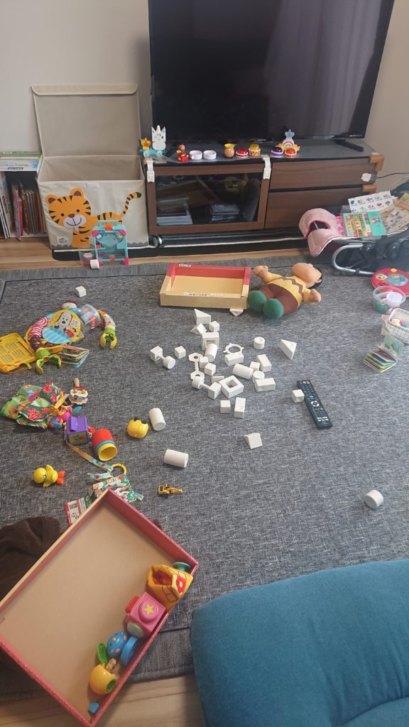 くみちゃんはお決まりの(食パン1枚、バナナ丸ごと一本、トマト二切れ、ヨーグルト1個)をもりもり食べて部屋の中をおもちゃで散乱させて、爆弾ウンチ様を出して出発です‼